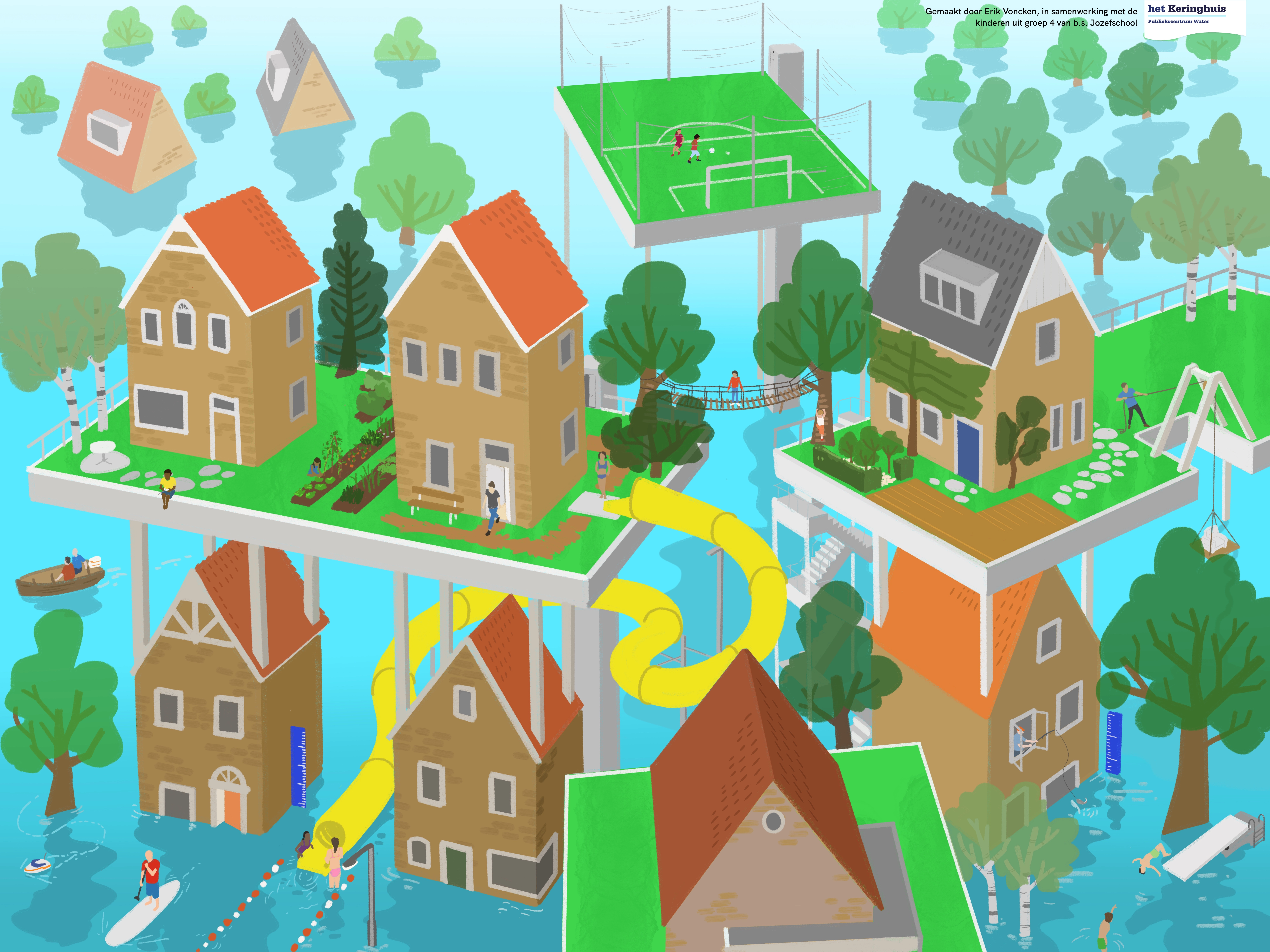 Tot slot: kinderen zijn vaak visueel ingesteld. Daarom is het gebruik van visuele hulpmiddelen een goede manier om educatie over klimaatverandering aantrekkelijk te maken. Dit kan o.a. met hulp van infographics, video's, afbeeldingen of live schetsen die de effecten van klimaatverandering laten zien. Hierdoor begrijpen kinderen beter wat klimaatverandering inhoudt en wat de gevolgen zijn. Een mooi voorbeeld is de visualisatie die je hierboven ziet, getekend door illustrator Erik Voncken. We lieten kinderen zelf ideeën bedenken voor het veranderende landschap door de zeespiegelstijging. Ze bedachten een huis met twee niveaus. Staat het water beneden te hoog? Dan loop je toch gewoon naar je tweede huis boven!