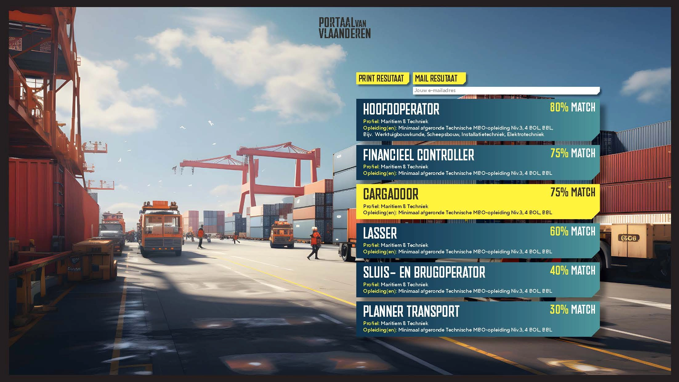 De medewerking van bedrijven, waaronder Yara, OVET, Mammoet, Vlaeynatie en Arentis, maken de beroepenroute authentiek. In het Portaal vertellen panelen met sprekende foto’s de verhalen, terwijl QR-codes de jongeren naar online opdrachten op de telefoon leiden. Daarnaast ontwikkelden we een interessetest die direct wordt gekoppeld aan het LOB-dossier van leerlingen. Zo ontstaat een beleving, waarin een offline ervaring en een digitale uitdaging jongeren inspireren voor hun toekomst in de haven.